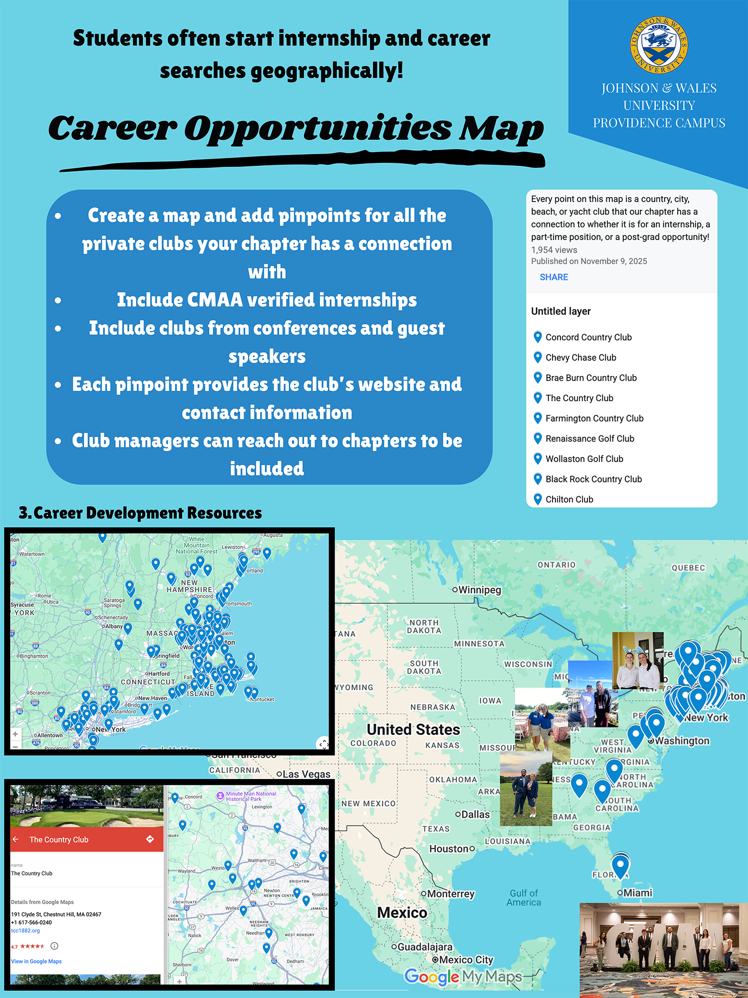 The Career Opportunities Map was created as a tool to help students easily find private clubs by geographic location. The clubs pinned on the map are ones our chapter has connections to, has visited at conferences, where alumni currently work, etc. The map has helped introduce new chapter members to the wide scope of the industry.