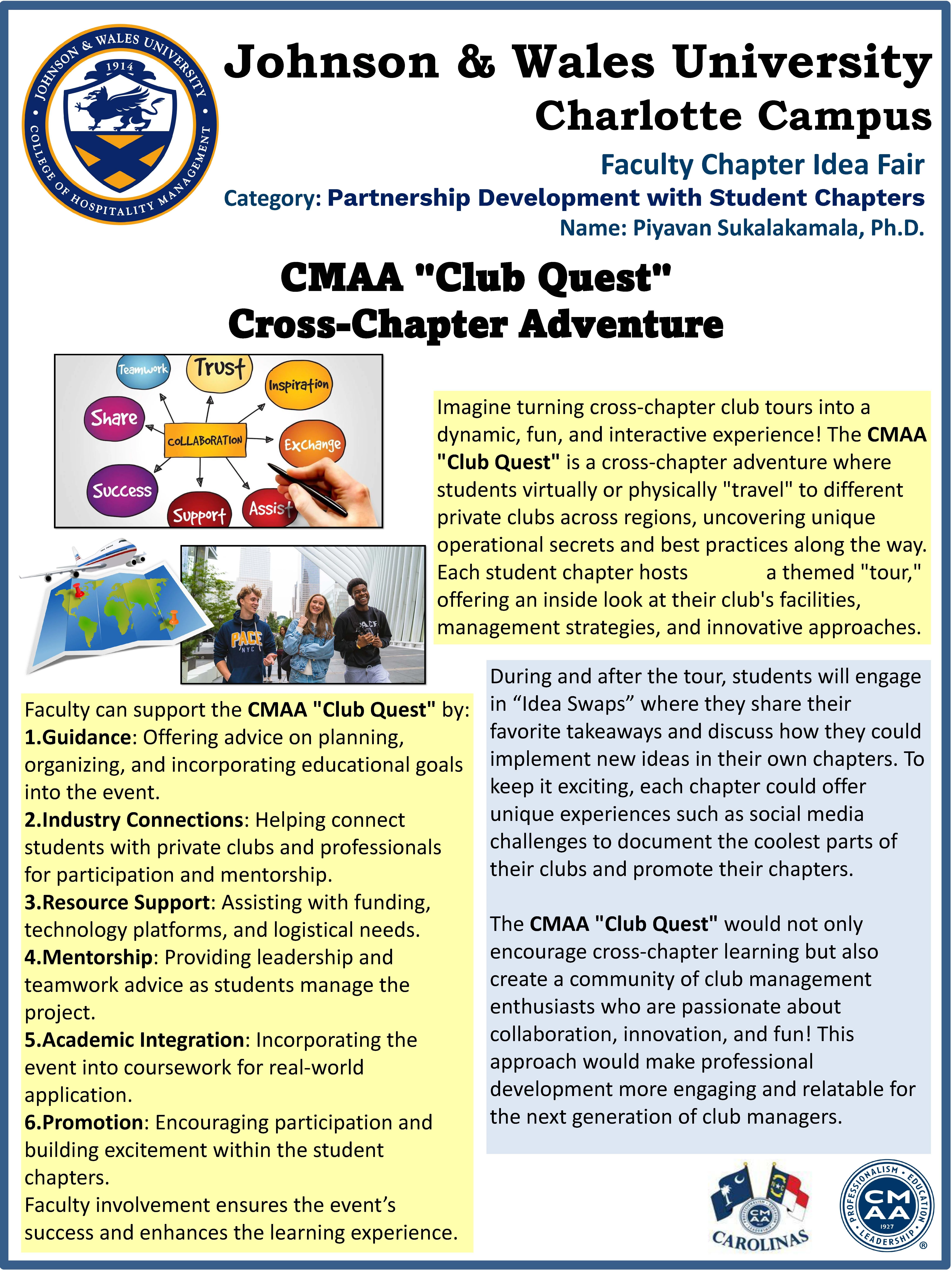 Even that this idea has not been implemented yet. The CMAA "Club Quest" transforms cross-chapter club tours into an engaging and educational experience for students. The CMAA "Club Quest" will not only promote cross-chapter learning but also cultivate a vibrant community of club management enthusiasts dedicated to collaboration, innovation, and fun. By engaging students in interactive experiences, it will help build connections among students while fostering a shared passion for the industry. This approach will make professional development more dynamic, engaging, and relevant, ensuring that the next generation of club managers is well-prepared and inspired for success.