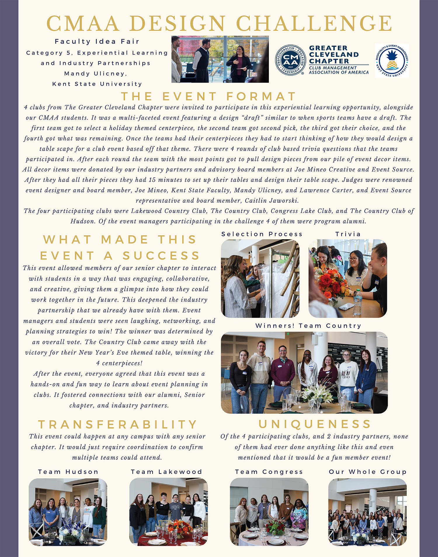 The idea was implemented in the Fall of 2025 for our CMAA student members at Kent State University. Chapter officers and faculty invited four local clubs to participate, strengthening partnerships with the Greater Cleveland Chapter. Two professional board members assisted with securing event décor and served as judges alongside faculty advisors, ensuring industry relevance.