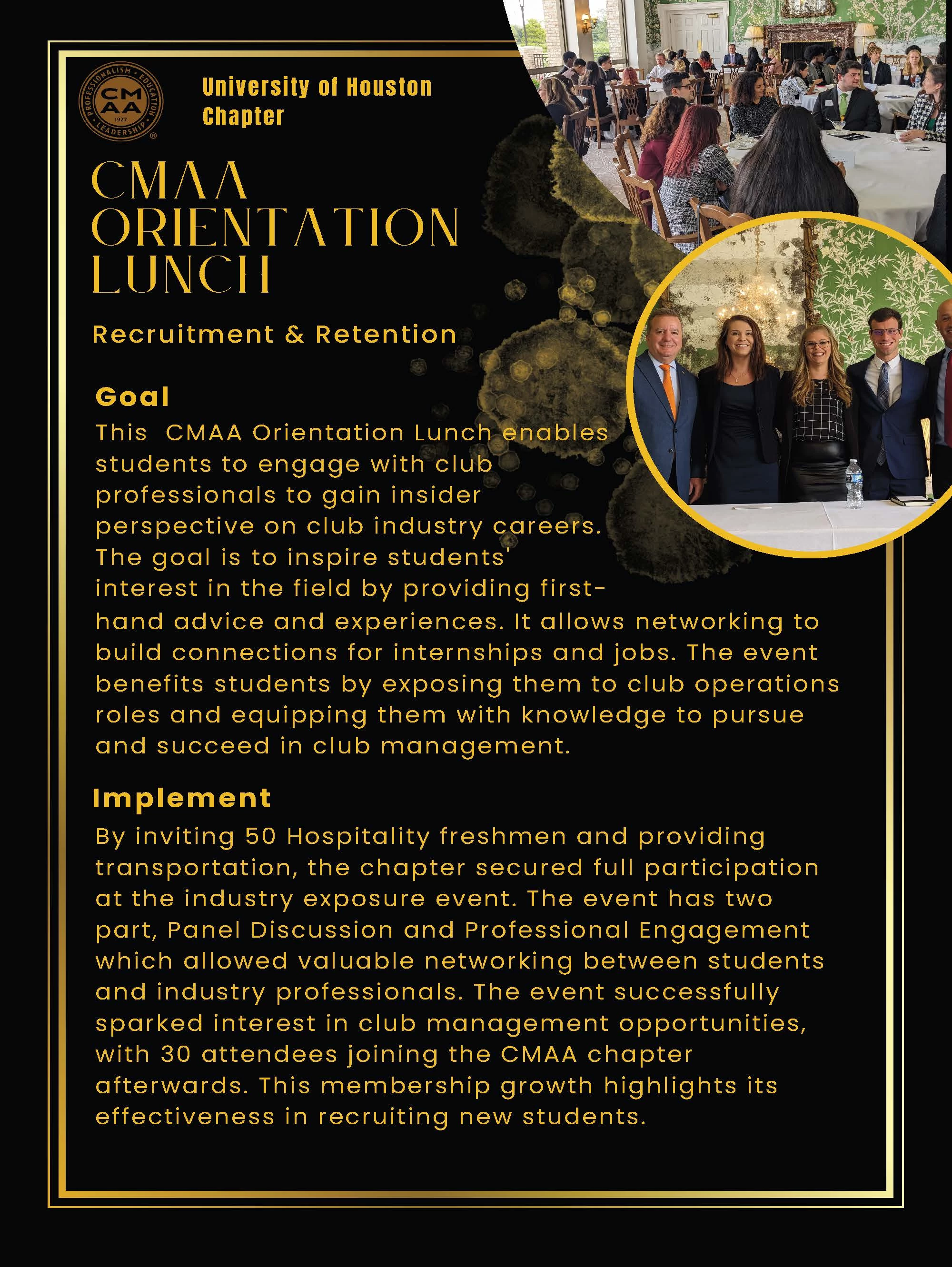 By inviting 50 Hospitality freshmen and providing transportation, the chapter secured full participation at the industry exposure event. The event has two part, Panel Discussion and Professional Engagement which allowed valuable networking between students and industry professionals. The event successfully sparked interest in club management opportunities, with 30 attendees joining the CMAA chapter afterwards. This membership growth highlights its effectiveness in recruiting new students.