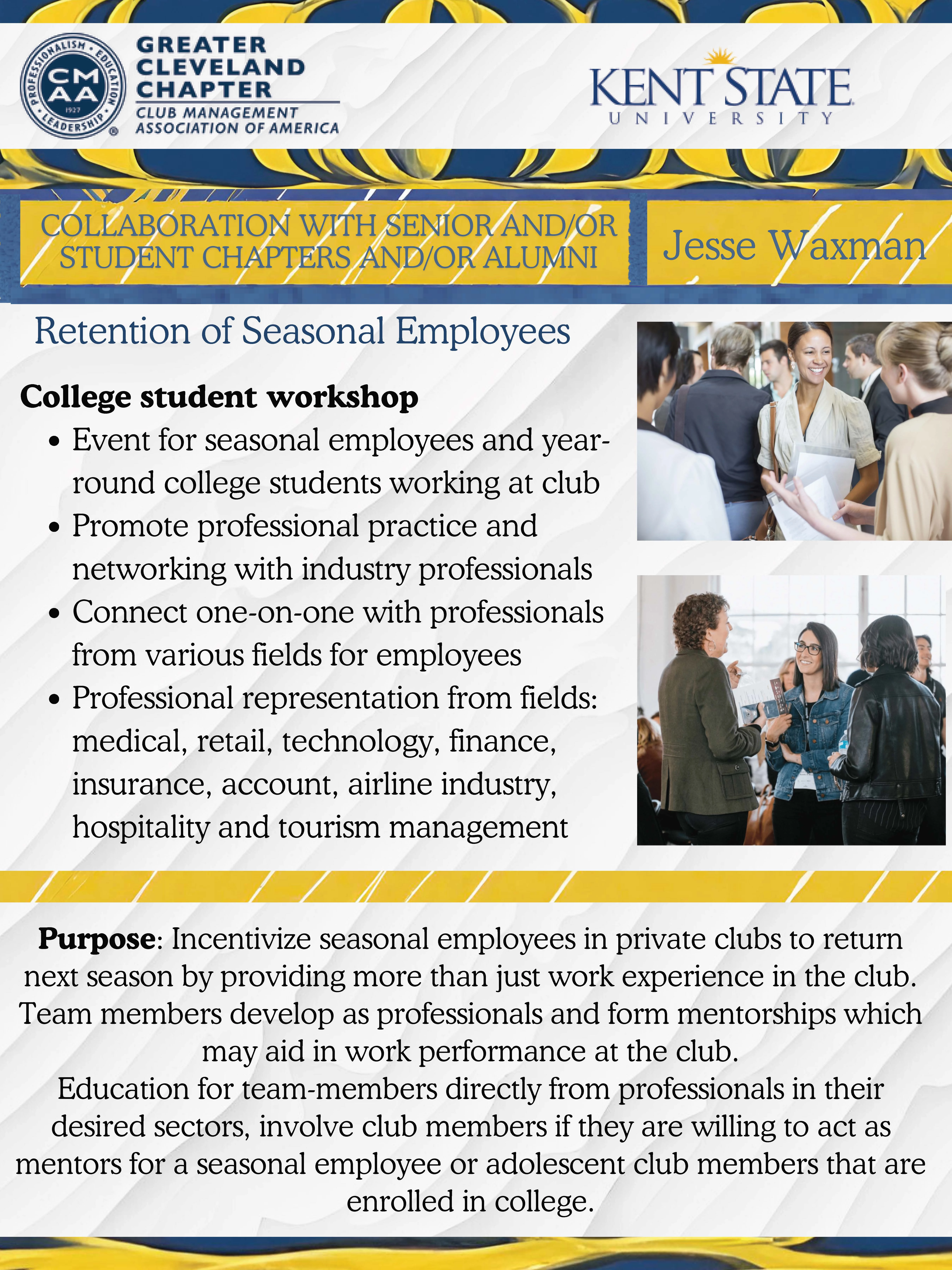 The idea is for private clubs to create a workshop event to develop their seasonal and student employees professional skills, by giving them an outlet for mentorship and one on one connections with industry professionals.