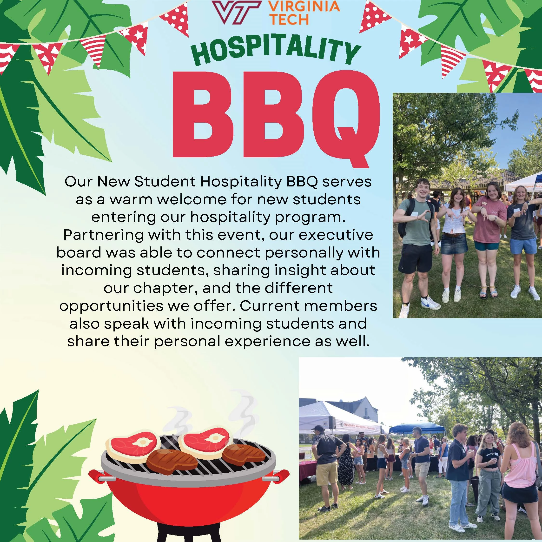 The BBQ was hosted by the Virginia Tech hospitality department and our executive board was asked to speak to new students and introduce them to our club. The event was promoted by the hospitality department, and our club reposted the promotions on our social media pages, so our returning members could join us. During the BBQ, our members and executive board actively socialized with incoming students and shared insights about our activities. We used the casual setting to make students feel at ease and answer any questions new students might have. After the event, we followed up with attendees via email and invited them to our first chapter meeting. Members appreciated the opportunity to speak highly about our chapter and welcome new students to campus. Incoming students brought up how they met us at the BBQ at our first meeting of the semester.