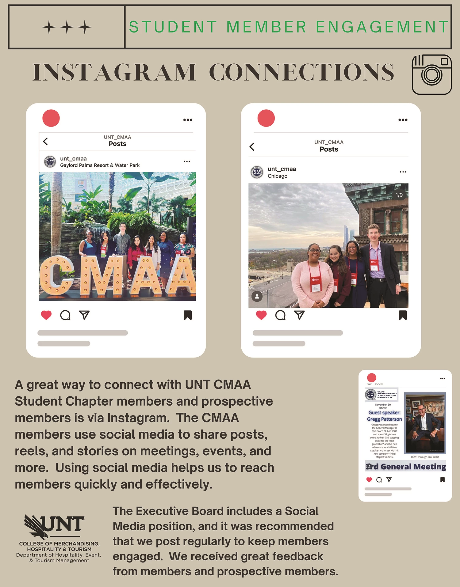 A great way to connect with UNT CMAA Student Chapter members and prospective members is via Instagram. The CMAA members use social media to share posts, reels, and stories on meetings, events, and more. Using social media helps us to reach members quickly and effectively.