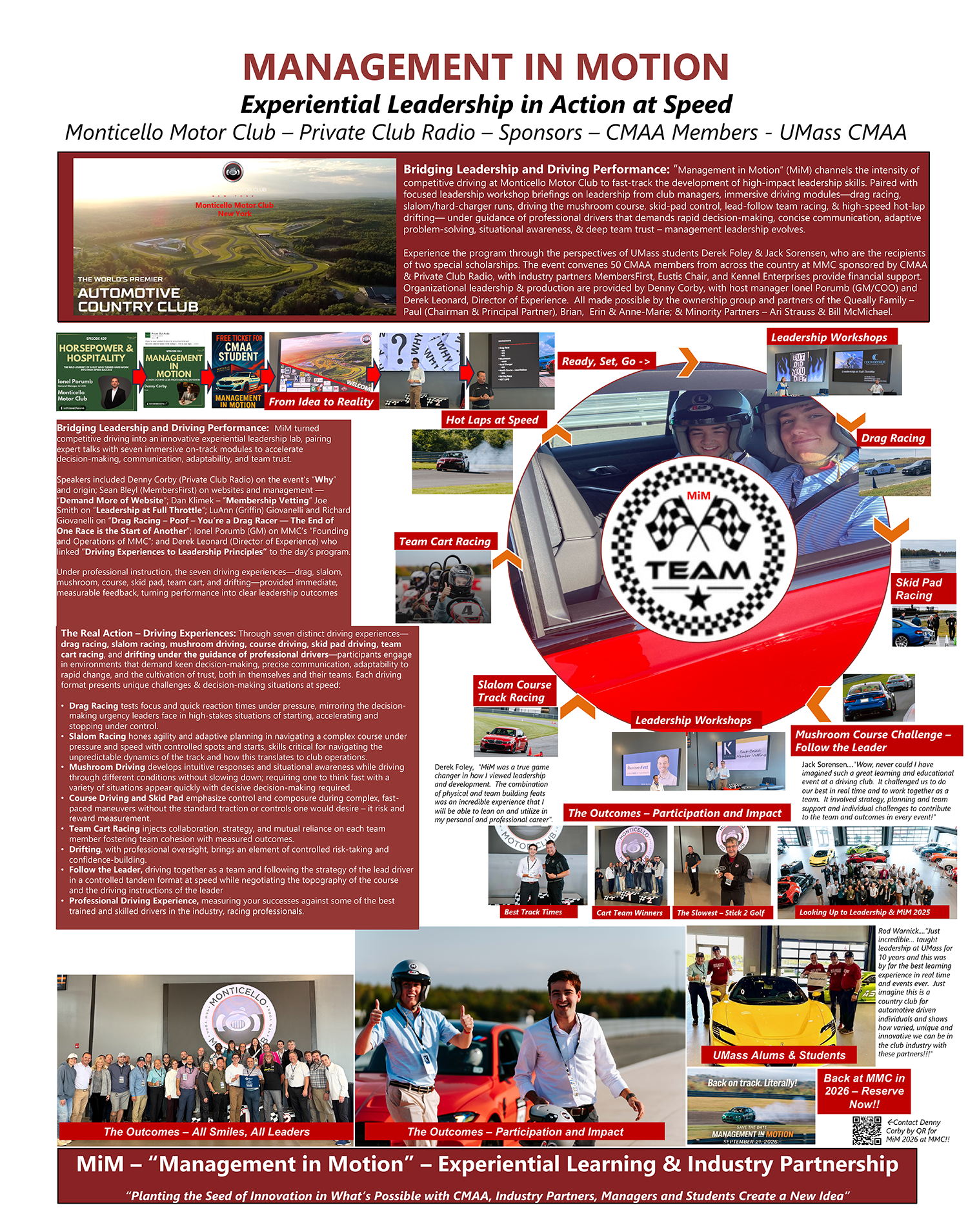 Experience the program through the perspectives of UMass students Derek Foley & Jack Sorensen, who are the recipients of two special workshop scholarships. The event convenes 50 CMAA members from across the country at MMC sponsored by CMAA & Private Club Radio, with industry partners MembersFirst, Eustis Chair, and Kennel Enterprises providing financial support. Organizational leadership & production are provided by Denny Corby, with host manager Ionel Porumb (GM/COO) and Derek Leonard, Director of Experience. All made possible by the ownership group and partners of the Queally Family – Paul (Chairman & Principal Partner), Brian, Erin & Anne-Maria; & Minority Partners – Ari Strauss & Bill McMichael.
