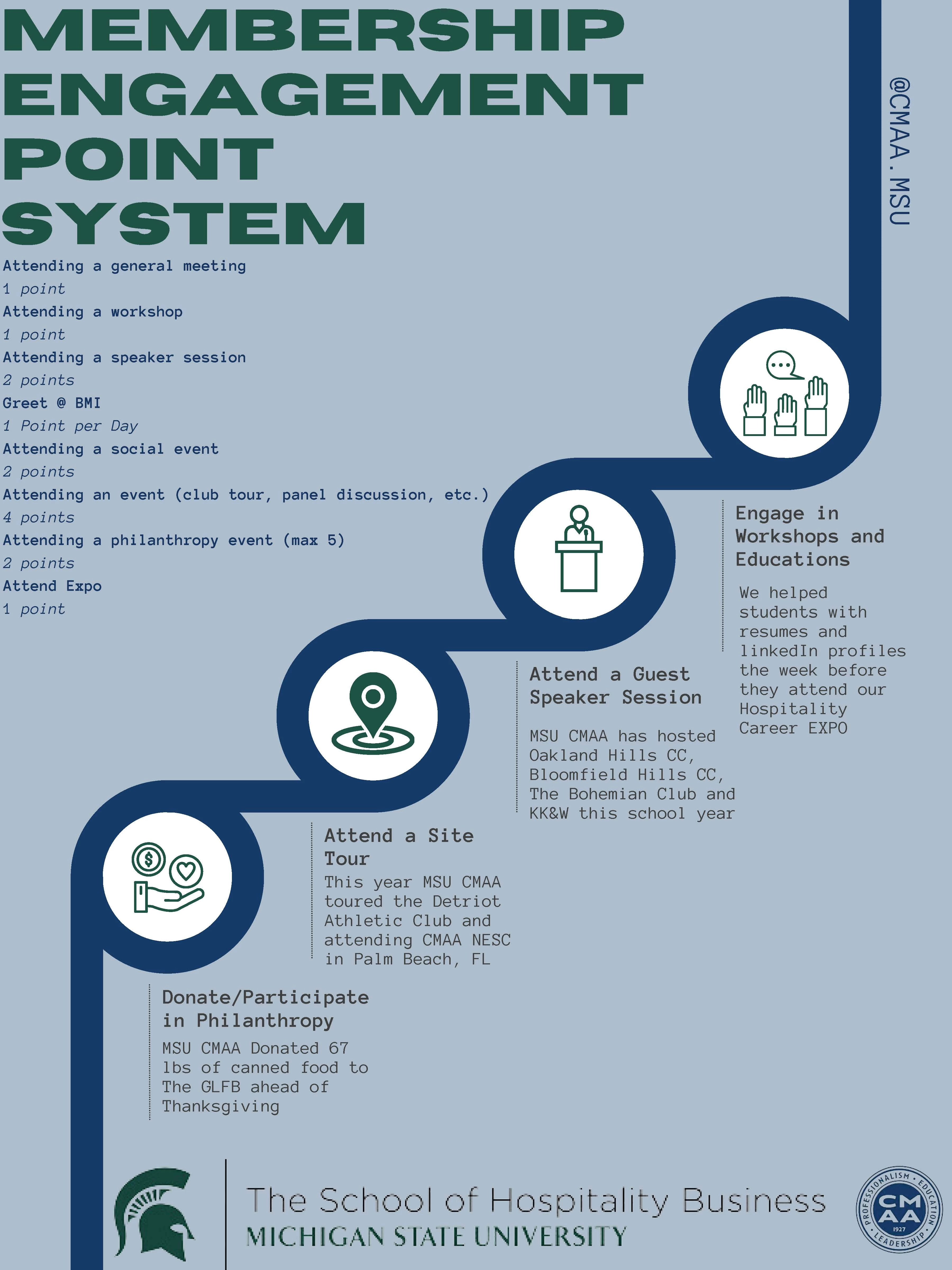 We use a point system to help retain members, recruit members and decide who is the most engaged students and deserving of attending CMAAs World Conference.