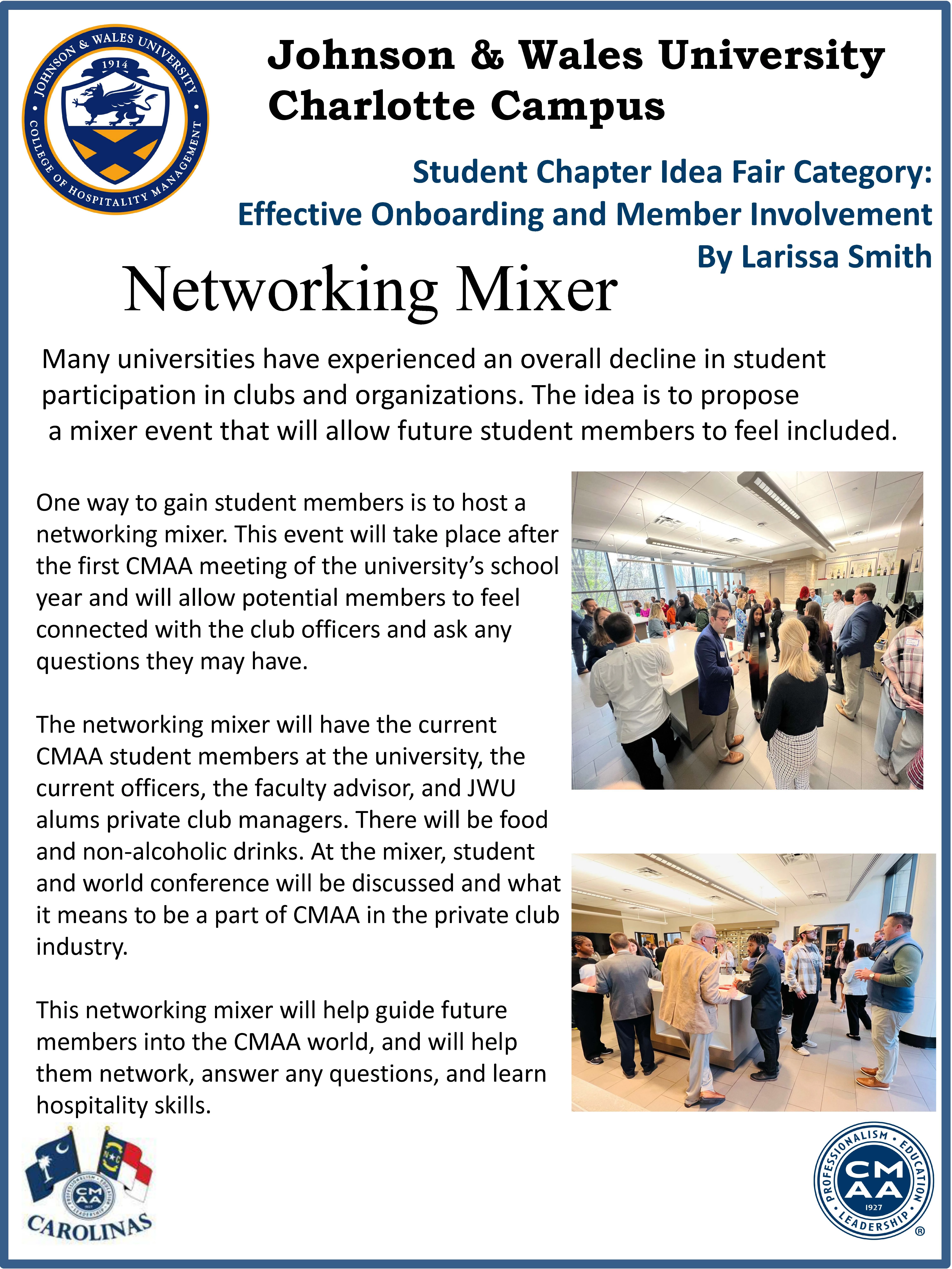Johnson and Wales University – Charlotte chapter members love this idea. This has been seen as a success from their perspective, particularly as the networking mixer has played a key role in attracting new members. Our club has experienced significant growth each year, with hospitality students increasingly entering the private club industry and enjoying the experience. The event also provides student members with the opportunity to break the ice and forge meaningful connections. In doing so, we are helping to pave the way for the success of future CMAA members.