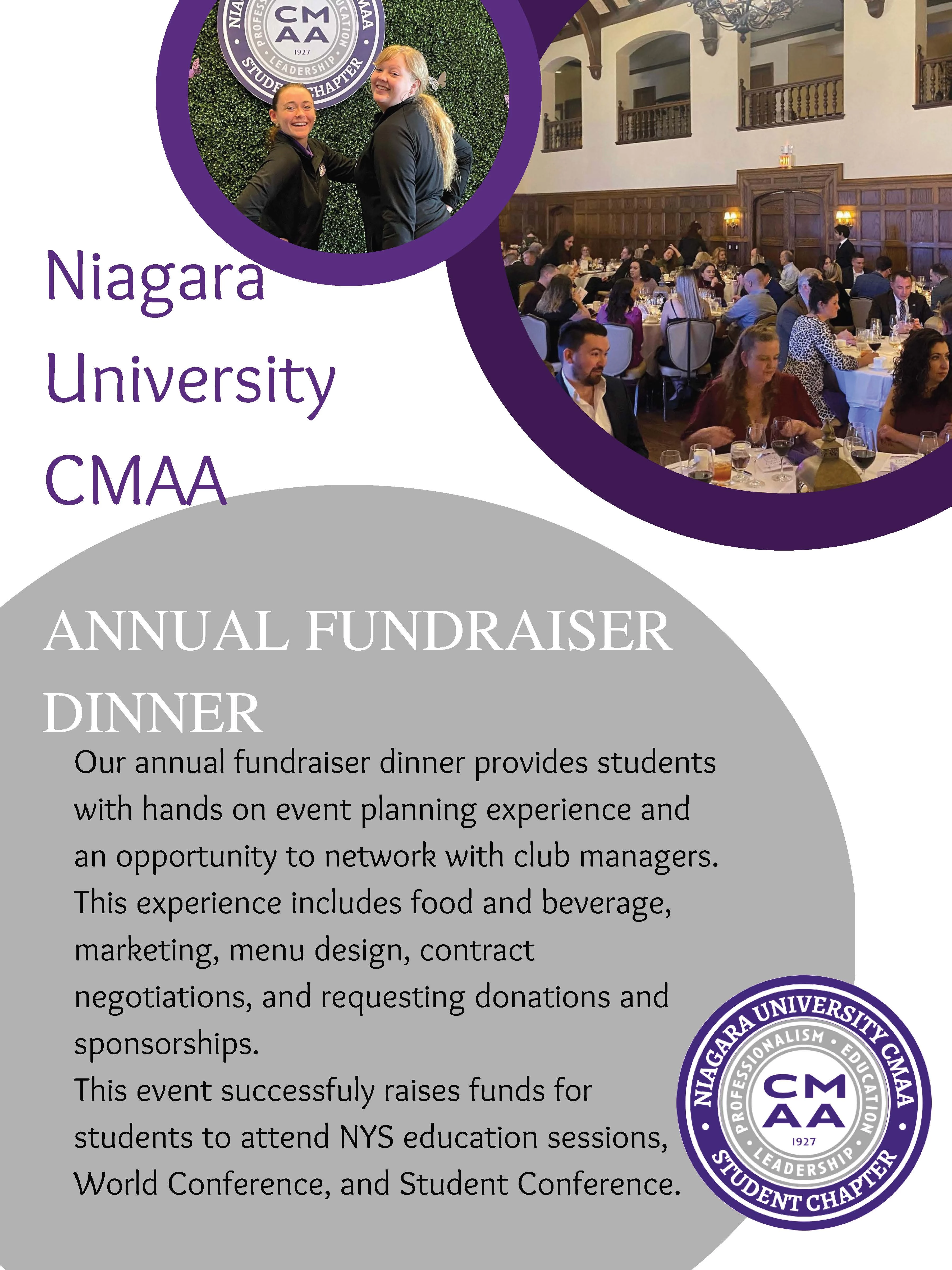 Every year, NU CMAA hosts a fundraiser dinner which brings together managers, family, and friends who want to support our student chapter. This event brings in funds as well as gives our students the hands on experience in the event industry.