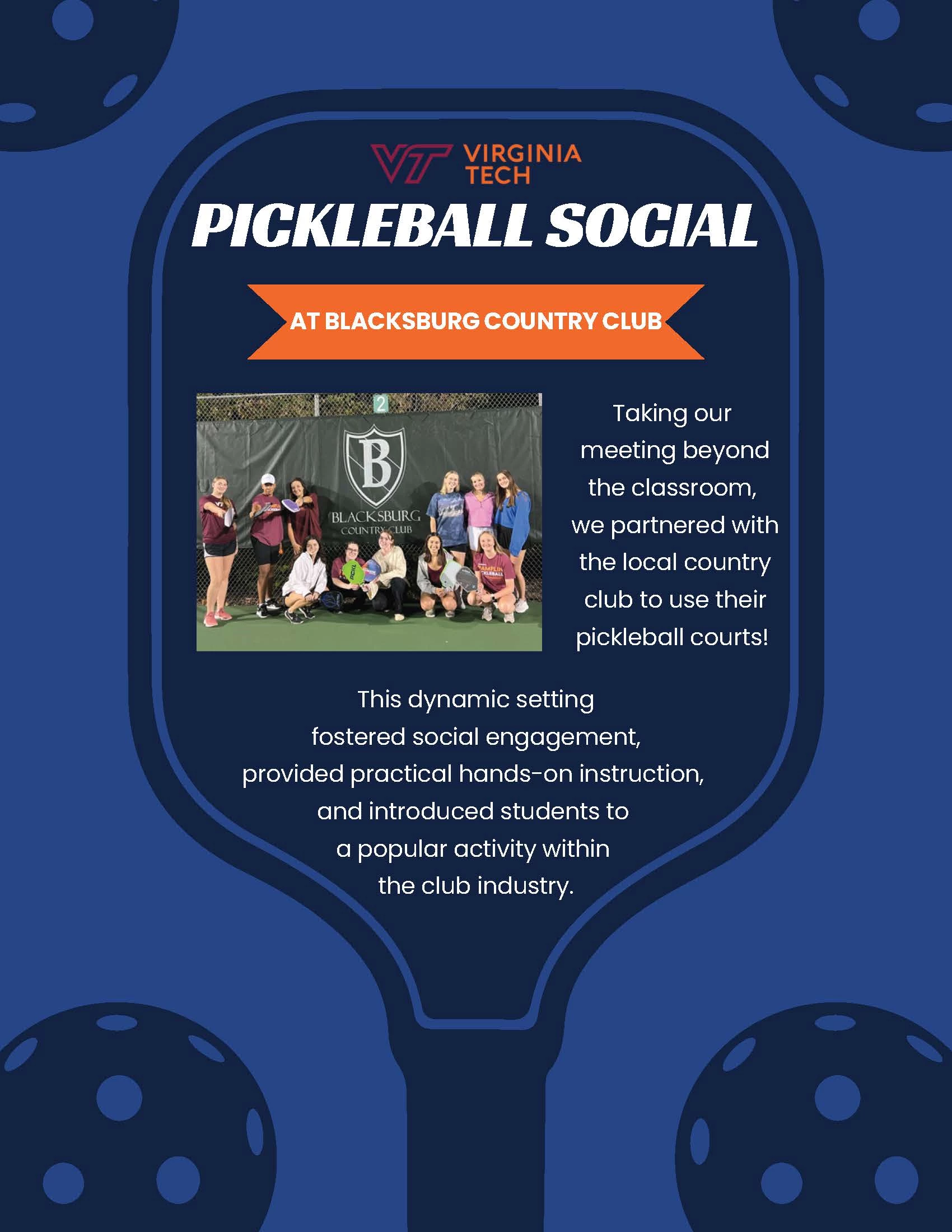 The pickleball social was a collaborative event hosted at Blacksburg Country Club, designed to take our chapter's meeting beyond the classroom. By partnering with a local country club to use their pickleball courts, we created an opportunity for members to experience a club environment. This event combined hands-on pickleball instruction with social engagement, introducing participants to a popular activity in the club industry. The setting allowed members to connect and learn about the sport in a professional yet relaxed atmosphere. This event strengthened our relationship with a local club, and provided members with exposure to a club setting. By offering an interactive experience outside the classroom, this social reinforced the value of active participation in chapter activities. Members gained insight into a popular activity within the private club industry, broadening their understanding of what makes clubs appealing to members and how these activities are managed. This event also fostered a sense of teamwork among members, as they worked together on the court and shared the experience of learning a new skill.