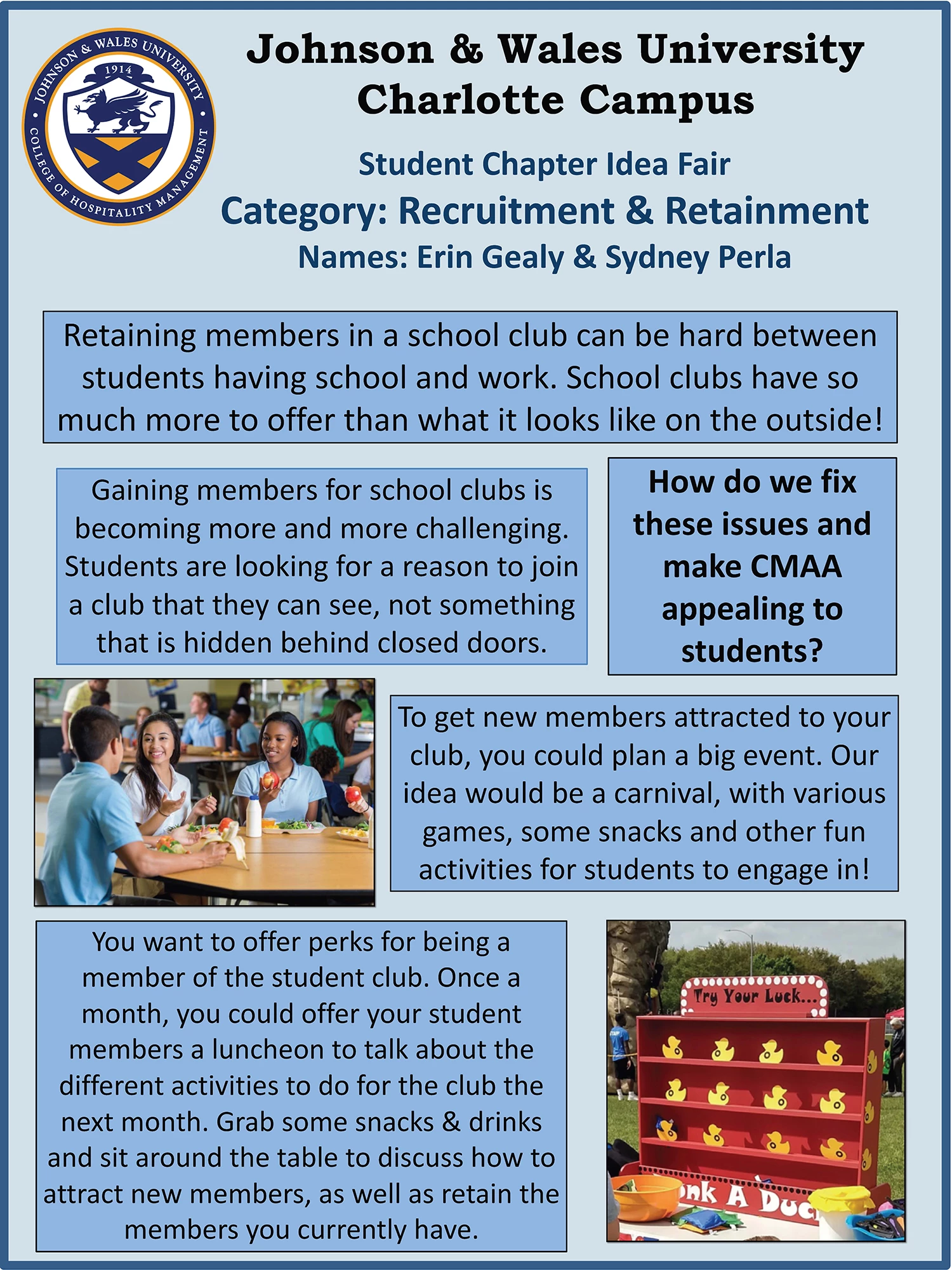 We want to attract members of our student body to become a member of our club on campus. We want to give them fun activities to join in on and get them excited about being a member of CMAA at JWU Charlotte.