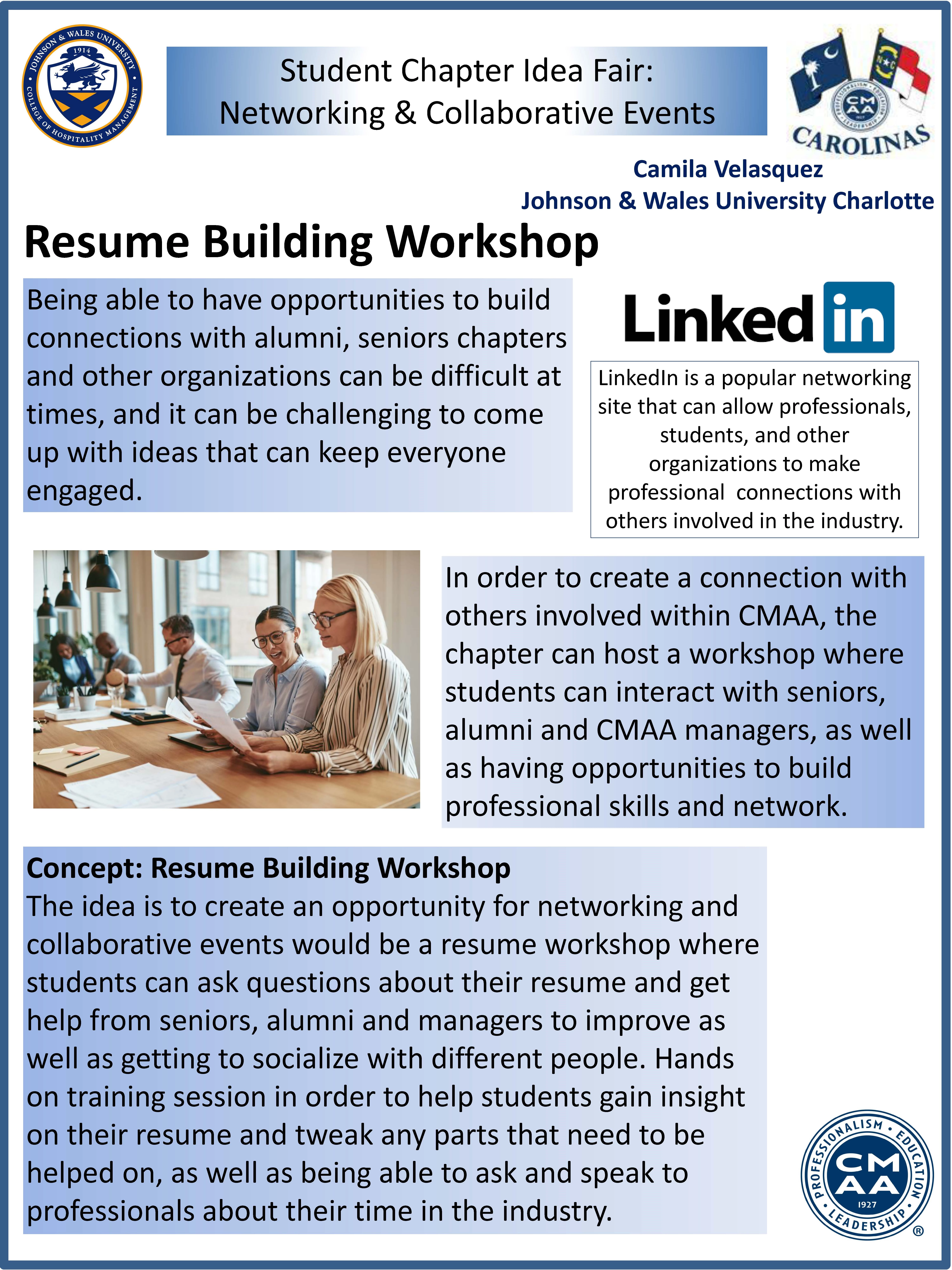 The CMAA student officers propose the idea of hosting a Resume Workshop event specifically for students interested in private club careers. While this event has not yet taken place, the university has previously organized similar workshops, and they have proven to be highly beneficial for students in other fields. We believe that by offering this event through the CMAA student organization, we can provide valuable support for students looking to enter the private club industry. The workshop would focus on helping students improve their resumes, providing tailored advice and guidance on how to stand out in this particular career field. By partnering with industry professionals, alumni, and senior chapter members, students would gain insights into the private club sector and receive feedback that would help them create more effective, professional resumes. Ultimately, we believe this workshop will be a valuable resource for students who are passionate about pursuing careers in the private club industry and want to enhance their job readiness.