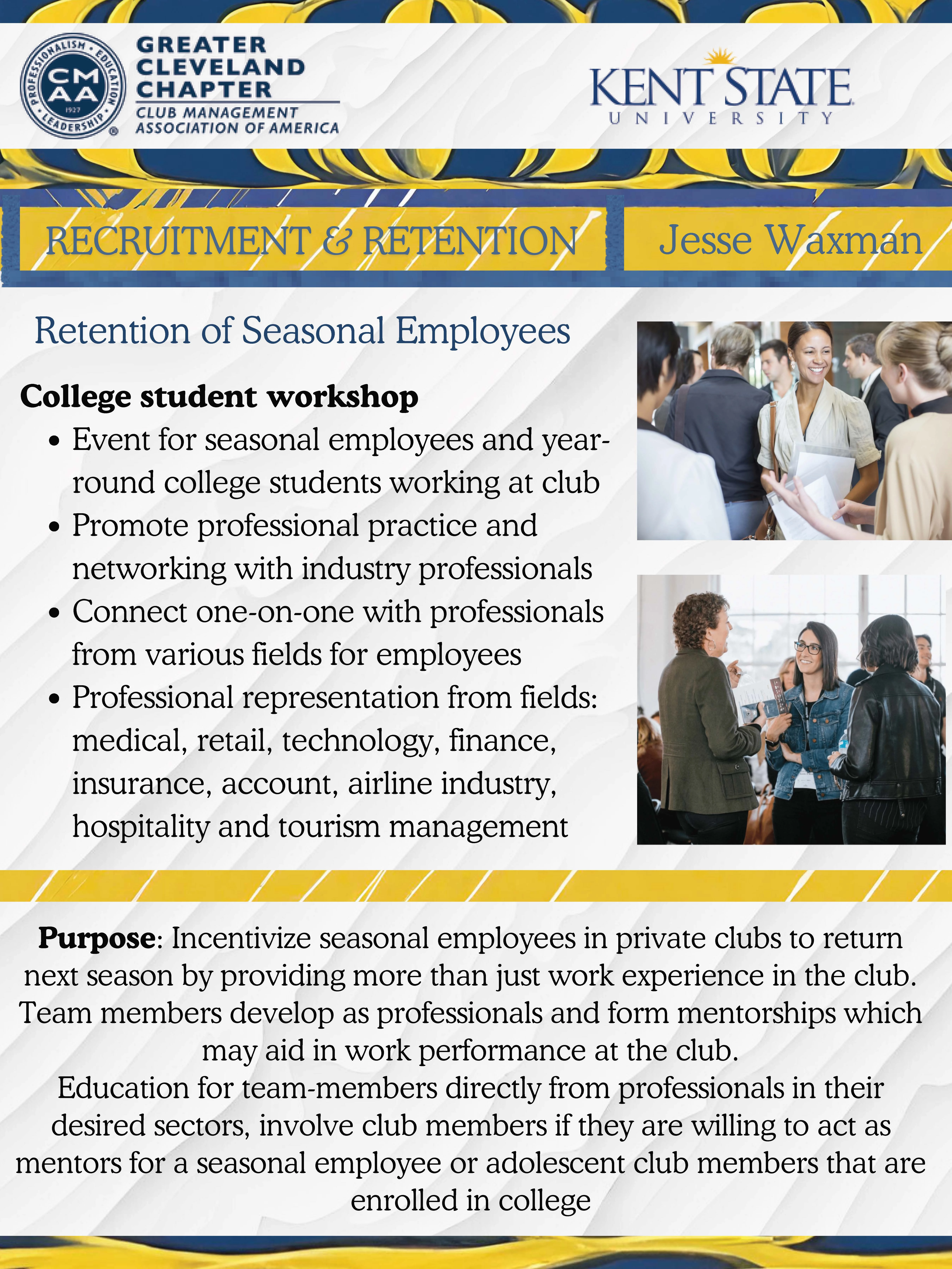 My idea is to build up the professional skills of seasonal and student employees at country clubs, which I feel benefits everyone involved and increases engagement and will increase workplace satisfaction with student employees at country clubs.