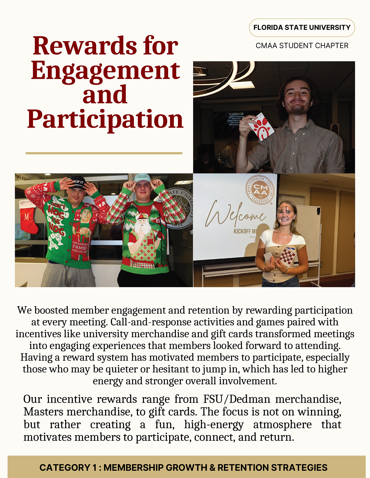 Our social events chair plans an activity for each meeting and alongside it, prizes. We figured that if our members had something to look forward to each meeting it would have to be something valuable to them. Before each meeting we buy gift cards to popular food places, or we get FSU/Dedman Merch, or sometimes even a Celcius pack will get them excited. Our members seem to really like this idea because it fosters an exciting atmosphere rather than just information overload all the time. They love knowing that there are rewards that make our time together energetic and fun!