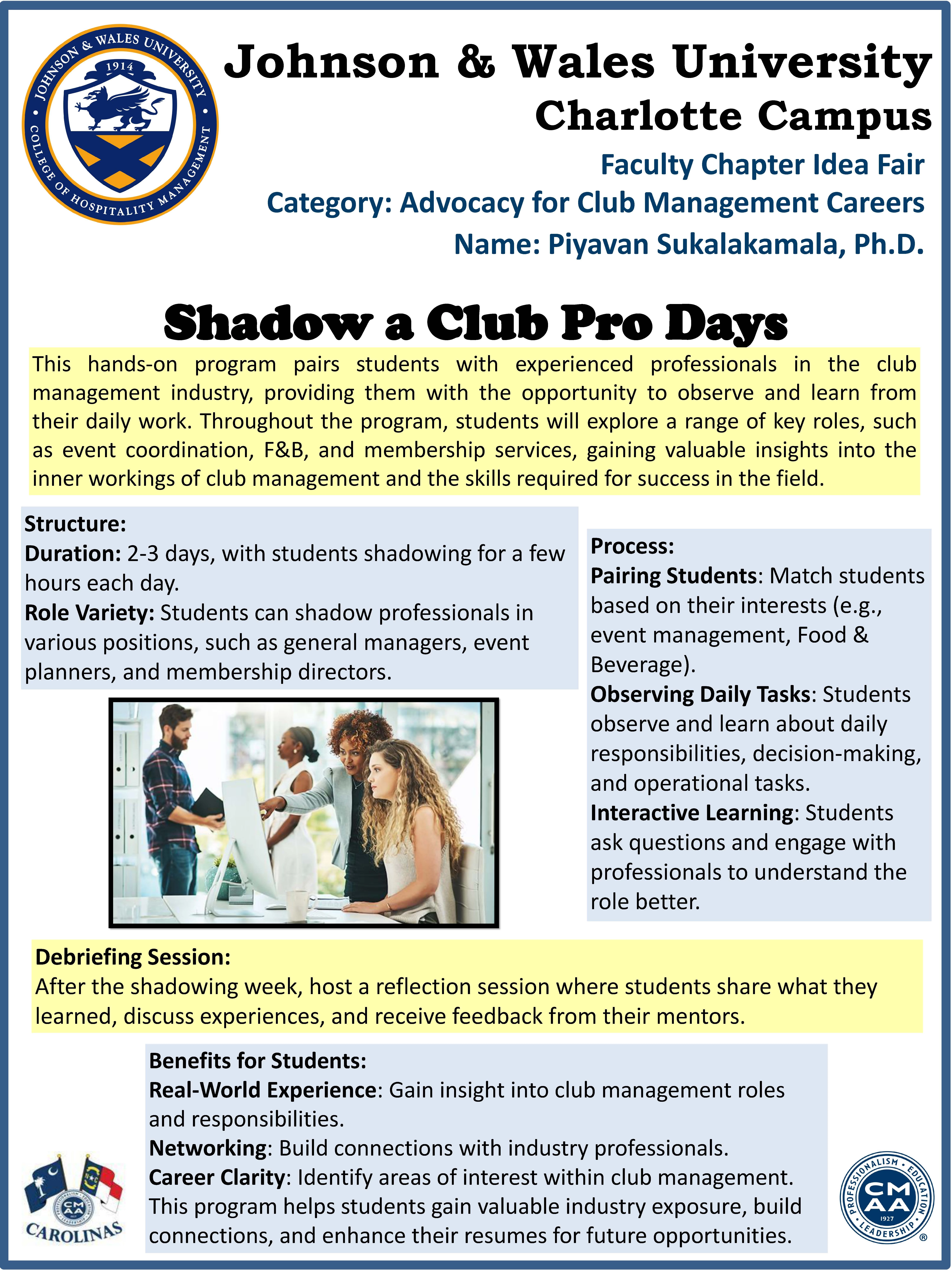 The idea behind this initiative stems from the growing interest among students to explore the private club industry in greater depth. While we have previously facilitated club tours and hosted guest speakers on campus, many students have expressed a desire for more practical, hands-on experience. Despite these efforts, a significant number of students still lack direct exposure to the day-to-day operations of a private club, leaving them uncertain about whether this career path aligns with their aspirations.