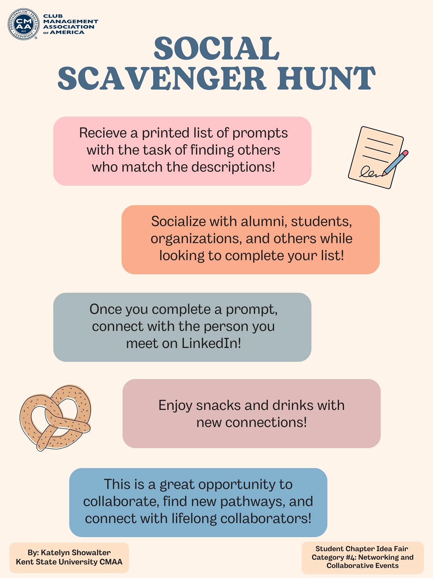 The Social Scavenger Hunt would be an event where student chapter members and club management professionals can connect. At this event, everyone would receive a list of prompts with certain criteria for people they can find, such as someone who lives and works in Florida, or a General Manager who has been working for over 30+ years. Each person's task would be to fill their list as much as they can, networking and connecting on social media along the way. This fun, collaborative, stress-free environment would be the perfect way for chapter students to meet others whom they may not have the pleasure to meet anywhere else and create long-lasting relationships.