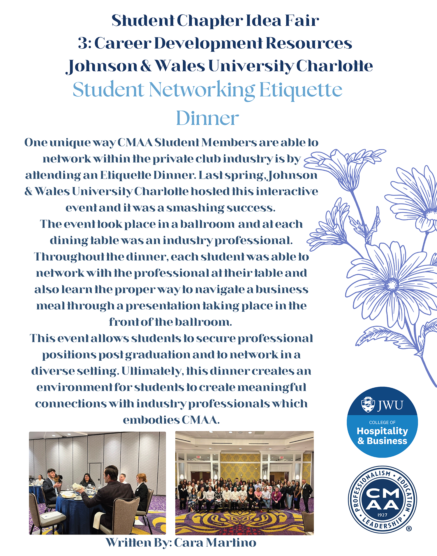 The Student Networking Etiquette Dinner enhanced Johnson & Wales University Charlotte CMAA chapter operations by providing an engaging experience that allowed students to network and prepare them for business meals. By hosting this event, students were able to learn the proper etiquette to use when at a formal job meal and network throughout the dinner with industry professionals. This event also provided opportunities to obtain professional positions post graduation.