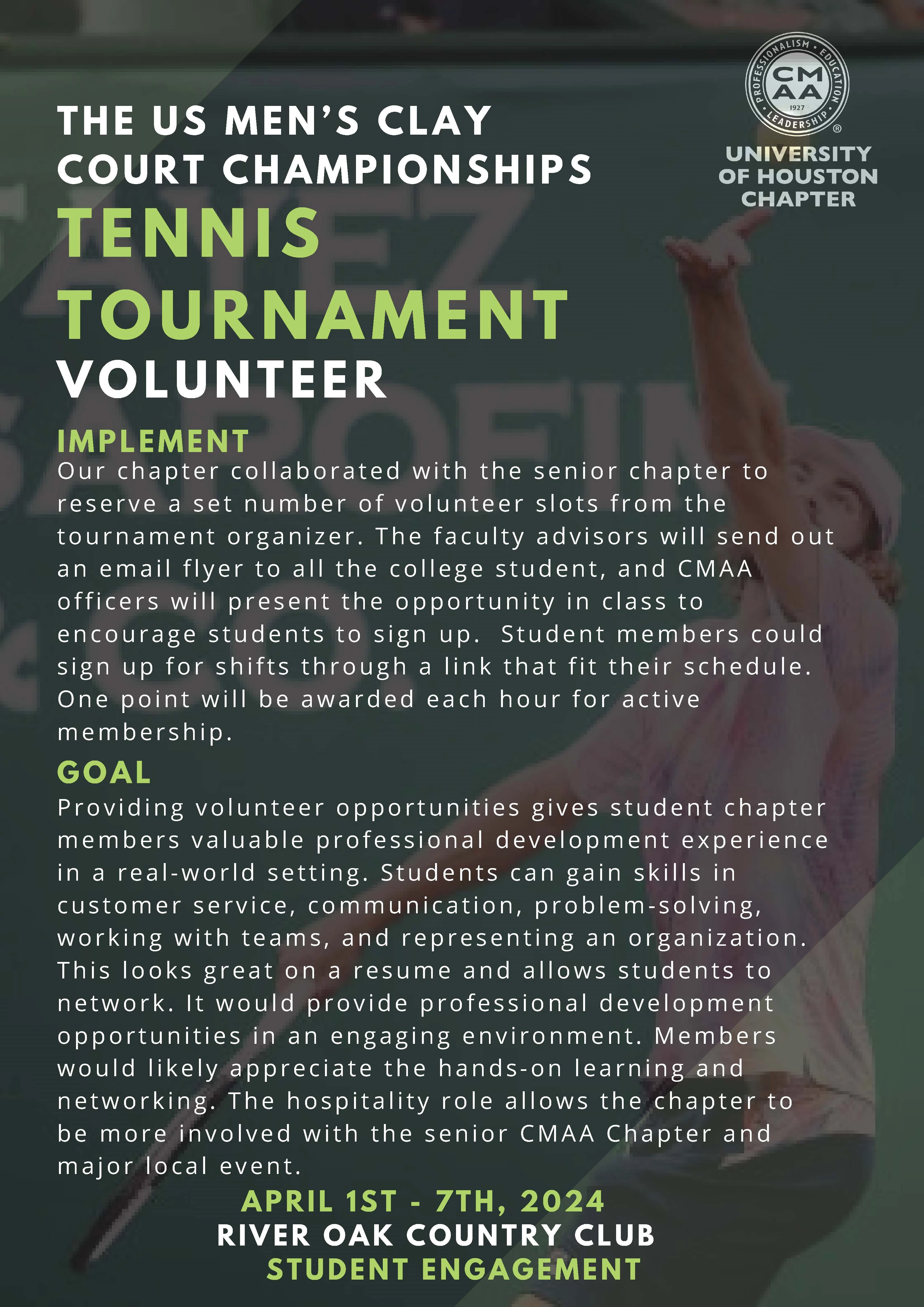 Our chapter collaborated with the senior chapter to reserve a set number of volunteer slots from the tournament organizer. The faculty advisors will send out an email flyer to all the college student, and CMAA officers will present the opportunity in class to encourage students to sign up. Student members could sign up for shifts through a link that fit their schedule. One point will be awarded each hour for active membership.