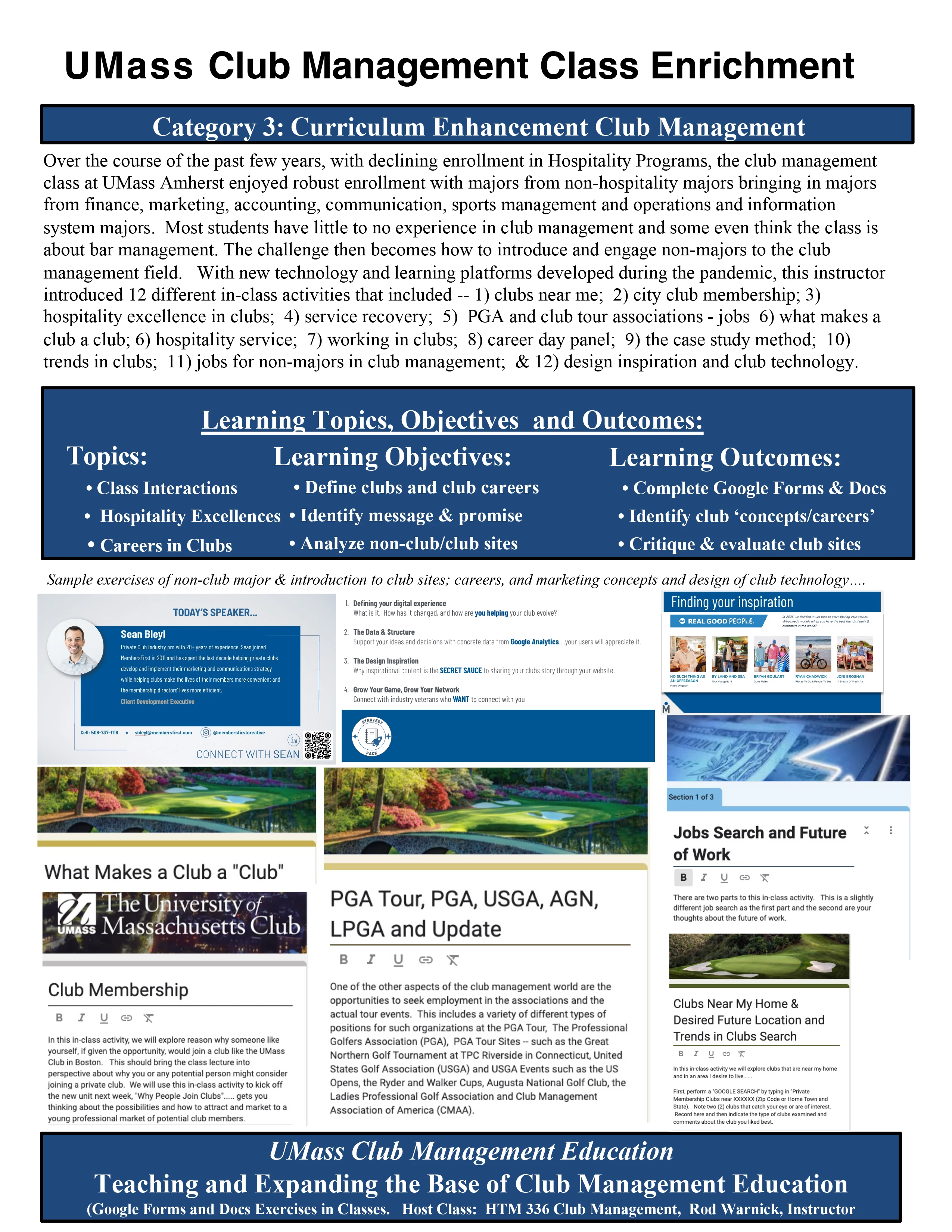 Over the course of the past few years, with declining enrollment in Hospitality Programs, the club management class at UMass Amherst enjoyed robust enrollment with majors from non-hospitality majors bringing in majors from finance, marketing, accounting, communication, sports management and operations and information system majors. Most students have little to no experience in club management and some even think the class is about bar management. Surprise - Surprise. The challenge then becomes how to introduce and engage non-majors to the club management field. With new technology and learning platforms developed during the pandemic, this instructor introduced 12 different in-class activities that included -- 1) club near my home and desired location; 2) city club membership; 3) hospitality excellence and service quality in clubs; 4) service recovery in club settings; 5) PGA and club tour association events and work: 6) what makes a club a club; 6) hospitality service expectations; 7) working in clubs and the GRIT scale; 8) career day panel; 9) the case study method and a trial case study in club management; 10) trends in clubs; 11) non-traditional jobs, jobs for non-majors in club management; and 12) design inspiration and club technology.