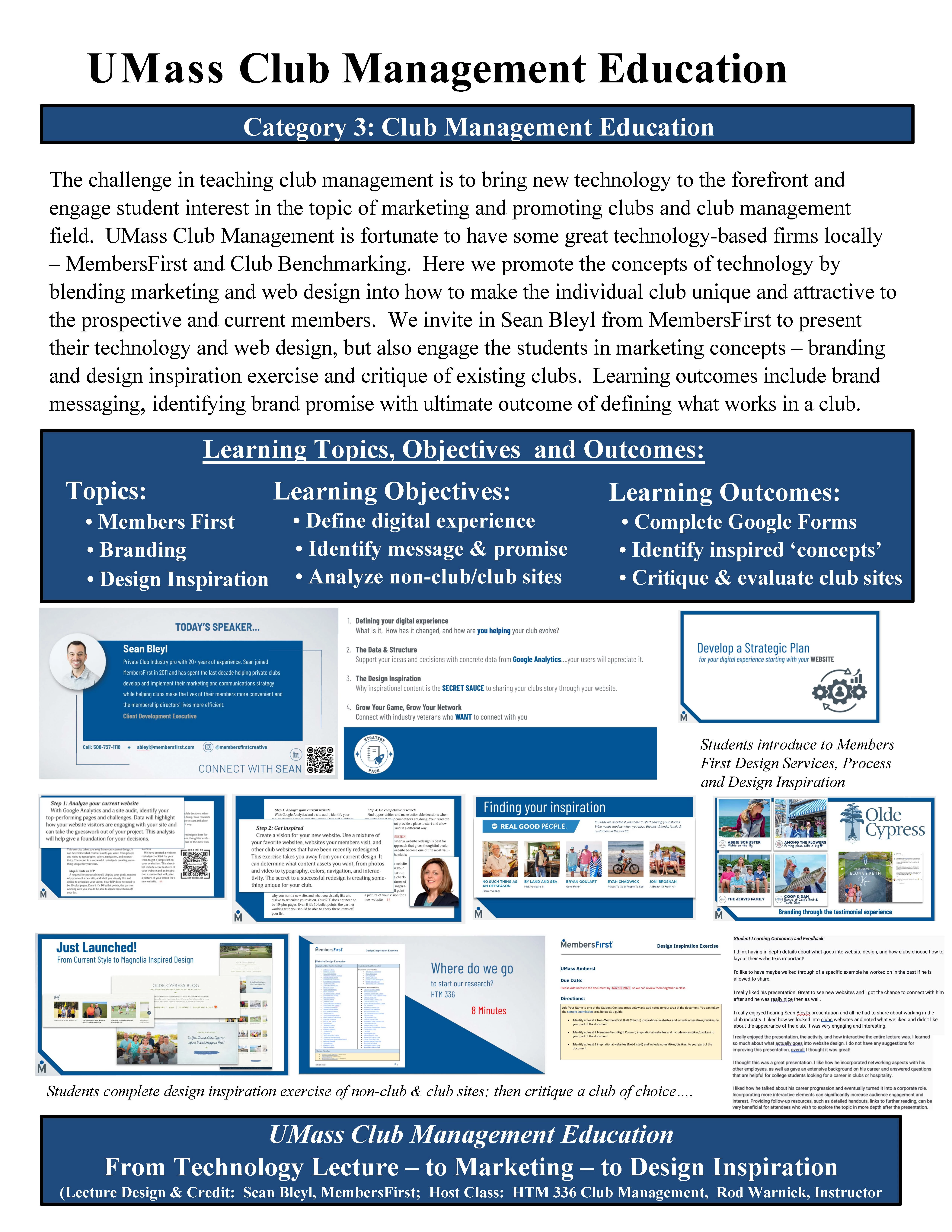 The University of Massachusetts has long taught a club management course, called HTM 336 Club Management in its accredited program of Hospitality and Tourism Management, now located in the Isenberg School of Management (Business School). The course now reaches a broader cross section of students, not just from hospitality, but from other majors in the college such as accounting, finance, operations and information systems, marketing, management and sport management. Students may specialize in club management but we are also reaching a new group of students who are taking the course as an upper level elective and want to know more about the club management field. Each year we have worked to bring in new topics areas including tournament event manangement, new case study topics, club benchmarking, and marketing concepts such as branding and web design into the course. In the last three - four years we have worked with MembersFirst of Wayland, MA where we have placed several students who have become project account managers and now product owners of speciality web design products for clubs. Specifically, we have brought Sean Bleyl, Client Development Executive into the course to lecture about web design, marketing and design inspiration as we integrate this lecture into our marketing lectures about how marketing in clubs is uniquely different than in private for-profit business.