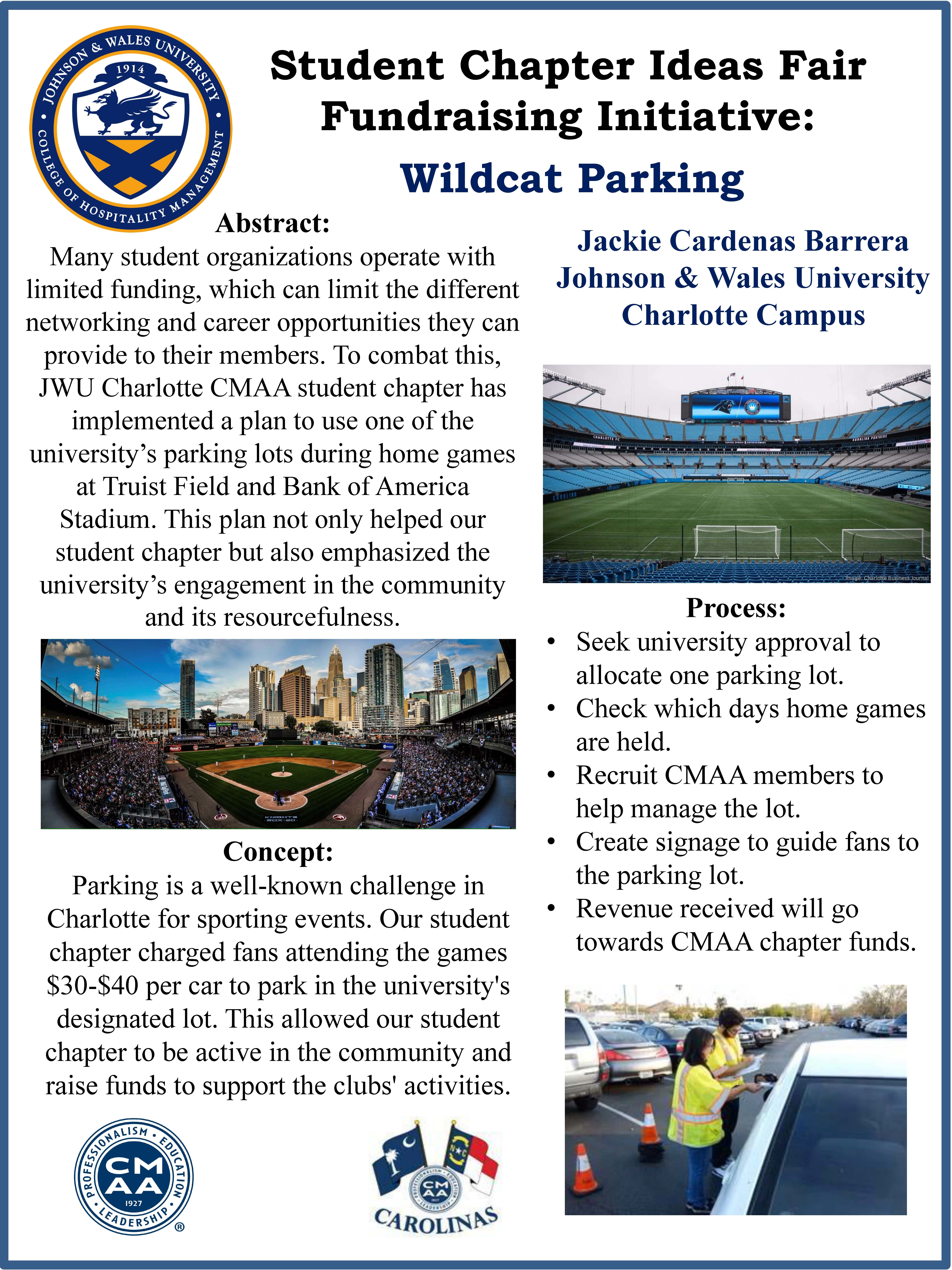 This idea was implemented by first seeking approval from the university’s administration. Once approved, we conducted a walkthrough of the parking lot and began recruiting members to assist with parking management and signage. Chapter members have been enthusiastic about the Wildcat Parking initiative. They have appreciated the opportunity to engage with the community, strengthen bonds among members, and witness how their efforts contribute to the chapter's success. JWU CMAA students were involved in this fundraising initiative for many years; however, following the pandemic, the university decided to discontinue the tradition. We would like to engage with the university administration to explore the possibility of reinstating this initiative.